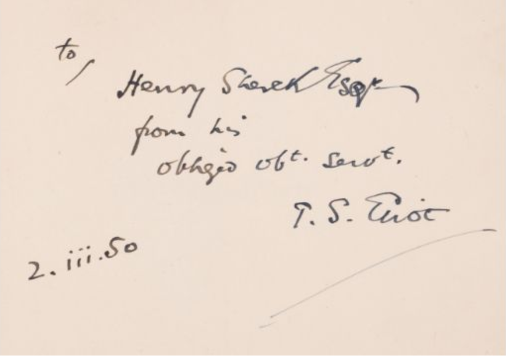 A copy of The Cocktail Party is being auctioned, inscribed “To Henry Sherek from his obliged obt. servt. T.S. Eliot.”