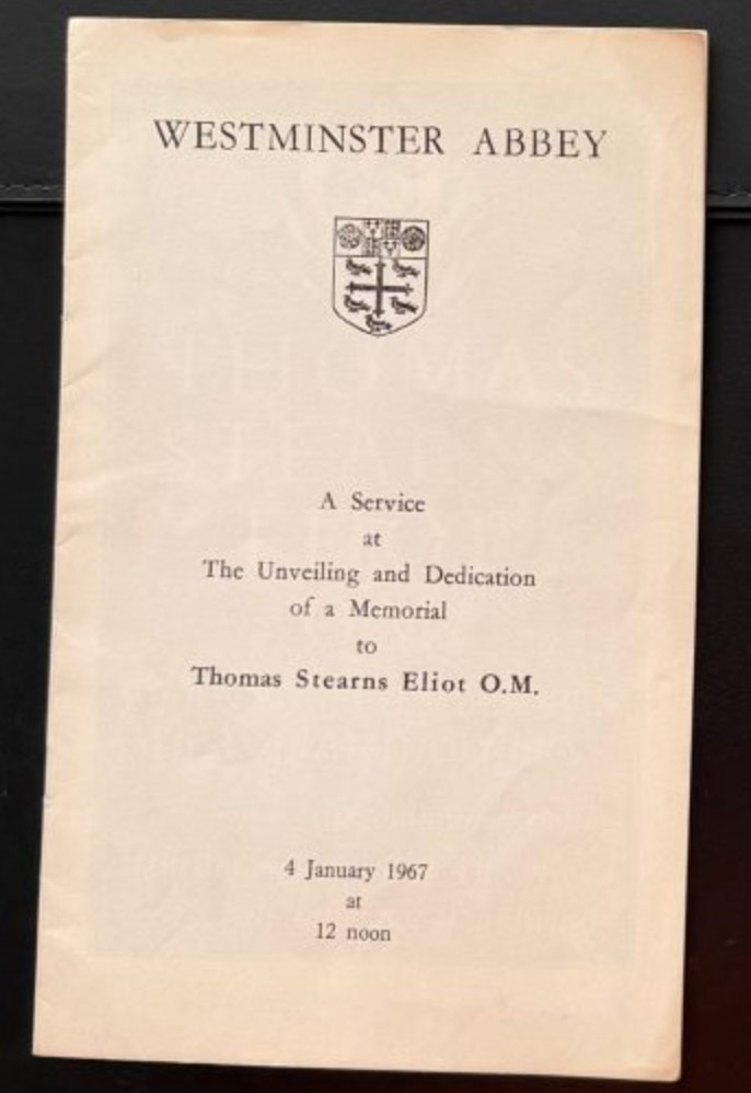 A collection of Eliot-related ephemera includes an Order of Service for the unveiling and dedication of his memorial tablet in Westminster Abbey’s ‘Poet’s Corner’.